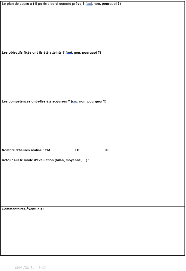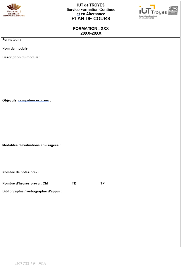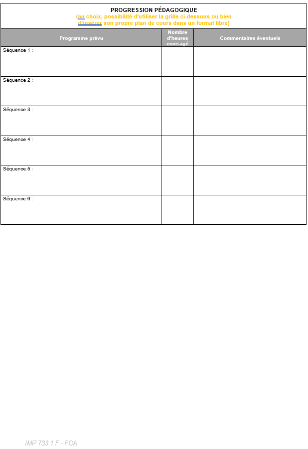 - le plan de cours incluant la progression pédagogique (cf imprimé pages suivantes ou sur l'Intranet – à voir avec le Responsable Pédagogique ou de Parcours).