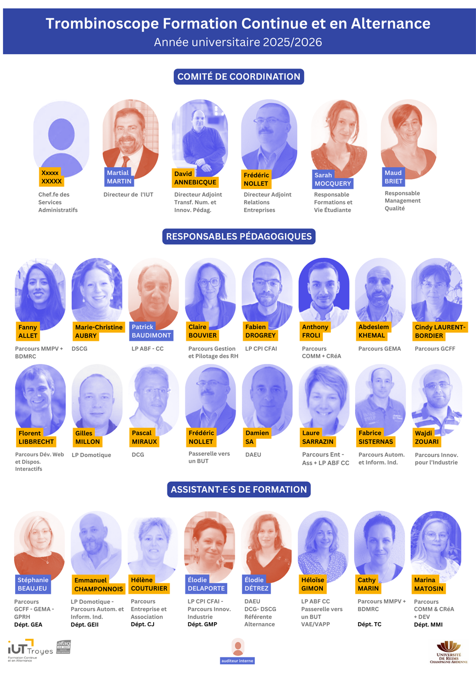 Nous sommes heureux de vous compter parmi nous comme formateur au sein de la Formation Continue et en Alternance de l’IUT de Troyes. Cette entité est certifiée ISO 9001 depuis le 28 avril 2004, d’abord dans sa version 2000, et constamment renouvelée depuis, et pour la dernière fois selon la version 2015, en avril 2025. Cette certification est garante de notre engagement dans un processus de perfectionnement de la formation que nous offrons aux apprenants. Cela correspond non seulement à une obligation légale mais surtout à un attachement de l’IUT de Troyes à la qualité du service proposé à ses usagers.